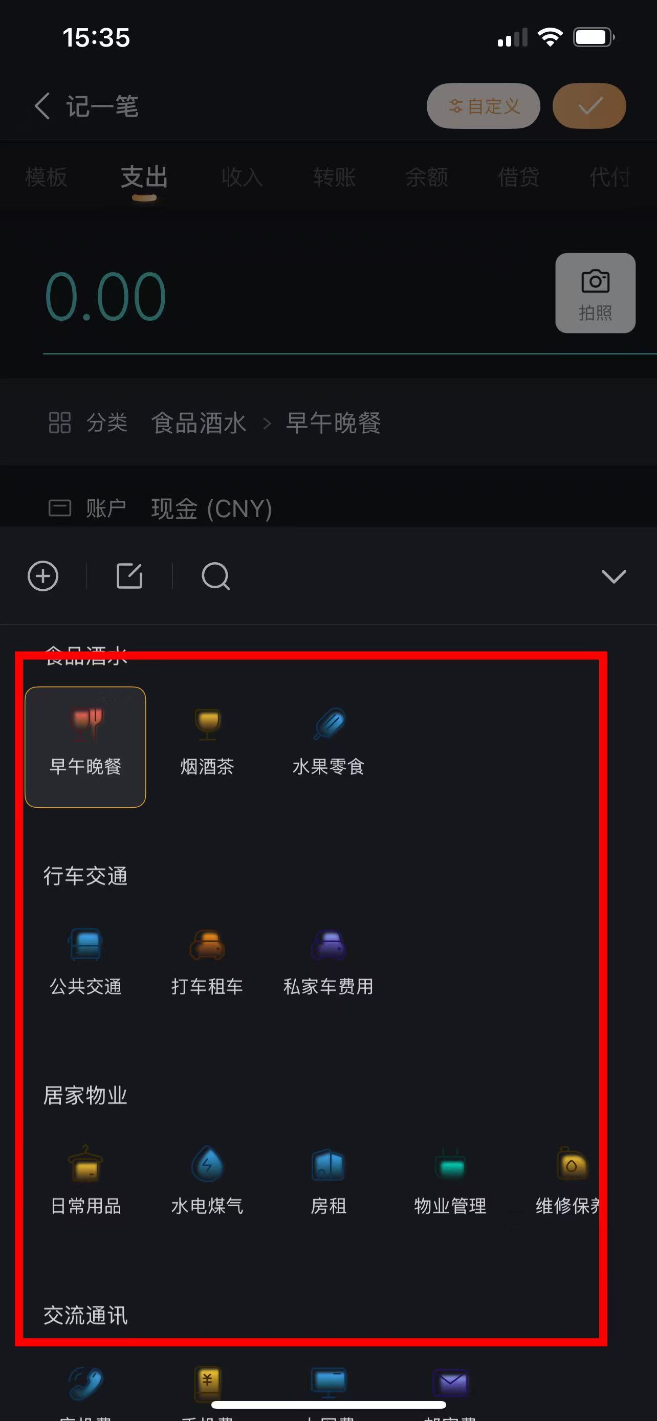 3、在记一笔的支出页面,可选择【早午晚餐】【烟酒茶】等分类,为要记录的支出选择对应的类别。