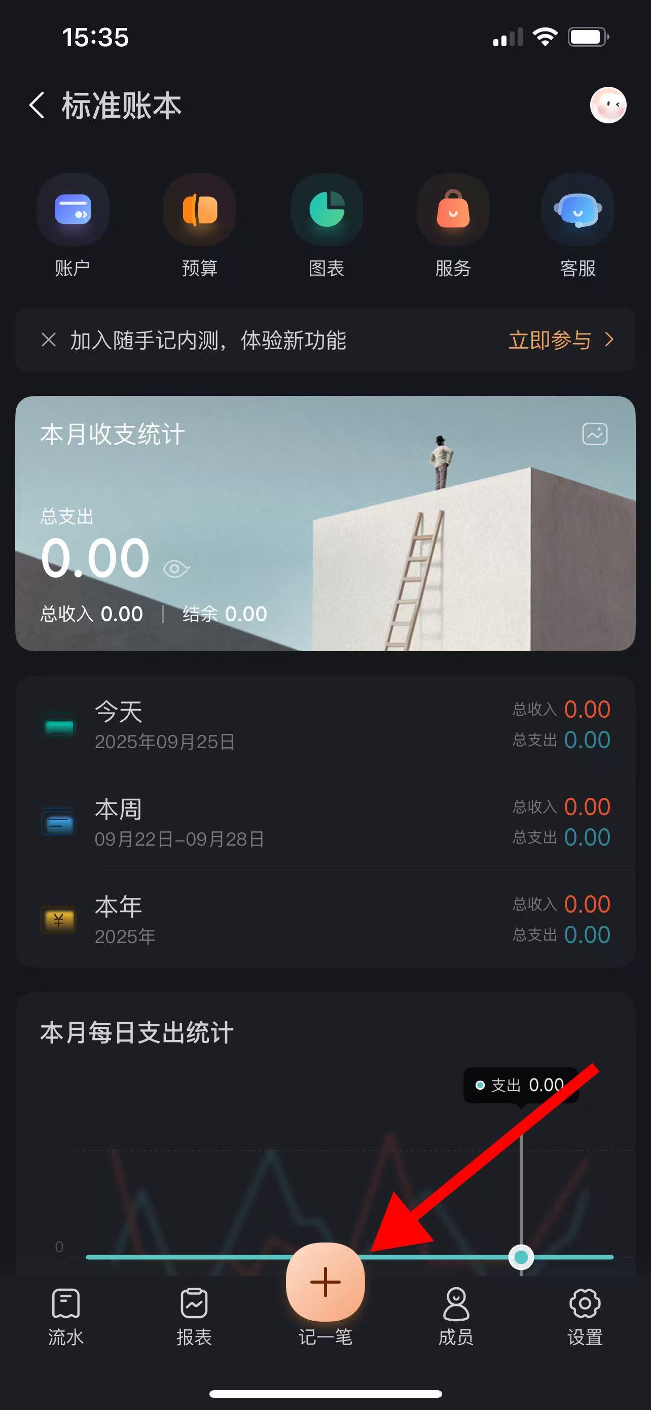 2、进入页面后,可查看本月收支统计等信息,点击底部【记一笔】,进入记账页面。