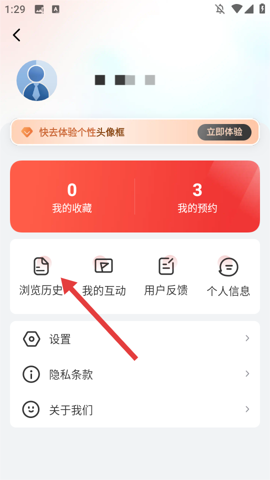 2、在个人中心页面,点击【浏览历史】选项,进入浏览历史列表页。