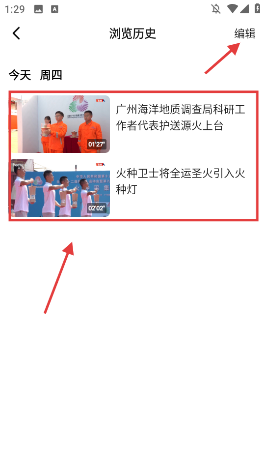 3、在浏览历史列表页,点击右上角的【编辑】按钮,进入编辑模式。