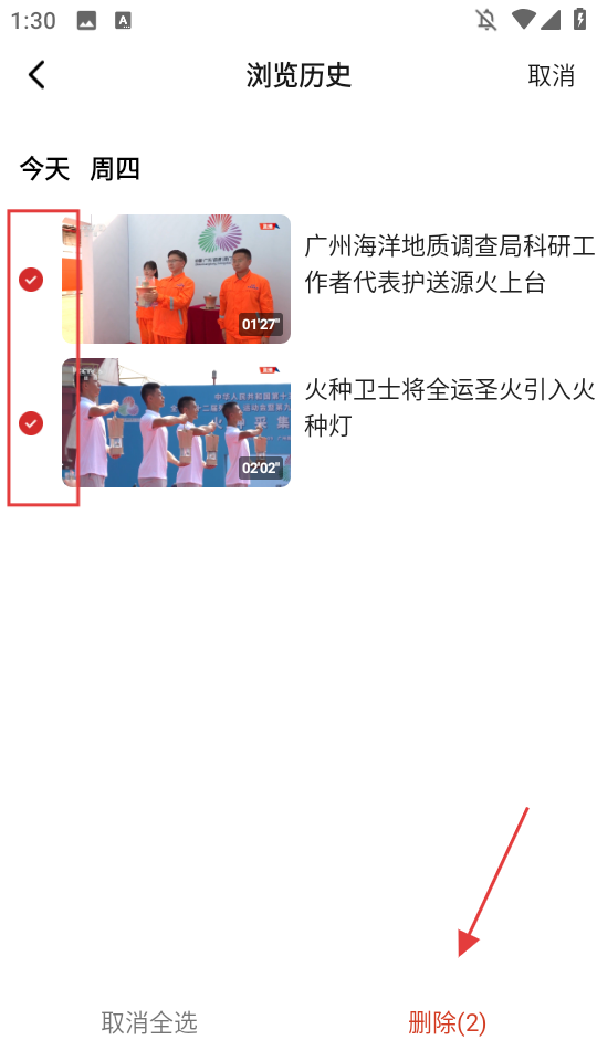 4、在编辑模式下,勾选需要删除的浏览历史条目,点击右下角的【删除】按钮,完成删除操作。