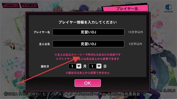 2、在玩家信息输入界面,填写(玩家名)、【主人公名】然后点击【OK】按钮。