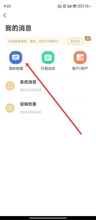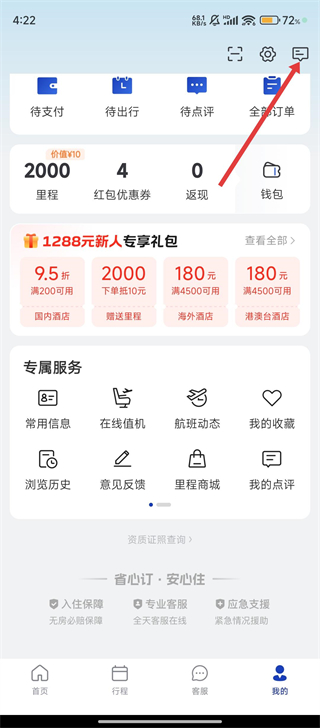 1、打开艺龙旅行App,在【我的页面】点击右上角消息图标,开启找客服的第一步呢。