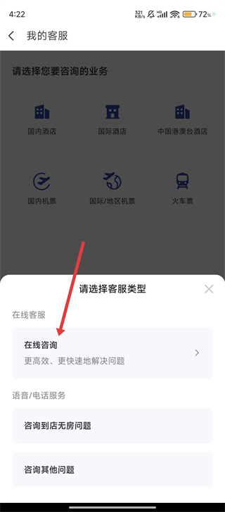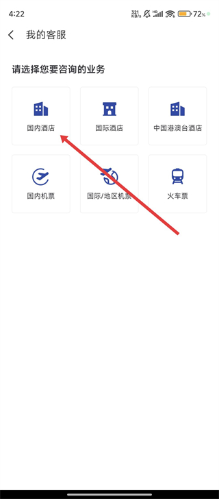3、在我的客服里,选择要咨询的业务,例如【国内酒店】,触发客服类型选择弹窗哦。