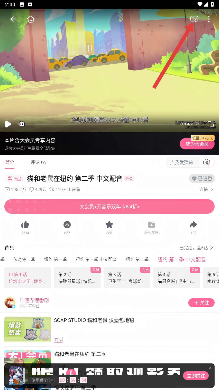 2、在动画专区里,找到要投屏的动画,像【猫和老鼠在纽约-第二季-中文配音】,点击它进入播放页面哦。