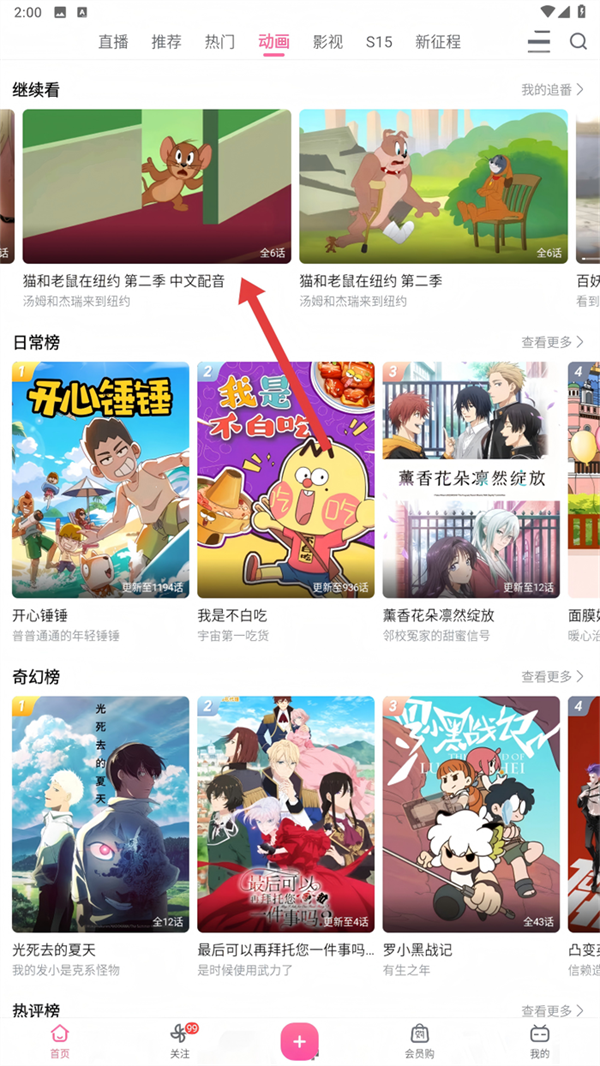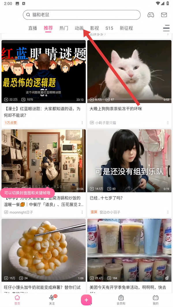 1、打开【哔哩哔哩】,我们可以点击顶部的【动画】分类,进入动画专区,挑选想要投屏的动画内容呀。