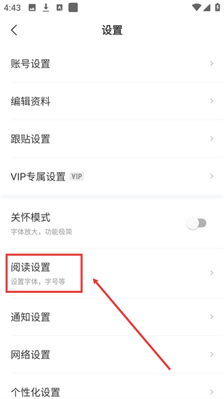 3、在【设置】页面找到【阅读设置】选项,点击即可进入阅读设置页面。