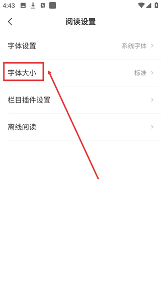 4、在阅读设置页面,点击【字体大小】选项,当前显示【标准】,点击即可进入字体大小调整界面。