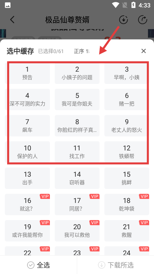 3、弹出“选中缓存”界面后,选择需要下载的章节。