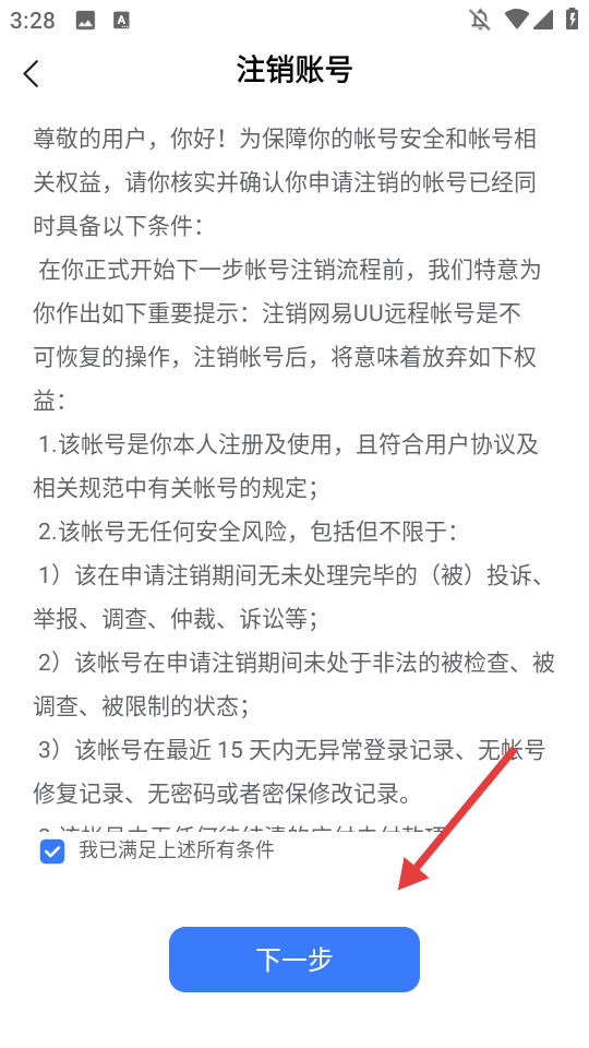 4、点击【下一步】,按照流程完成账号注销操作。