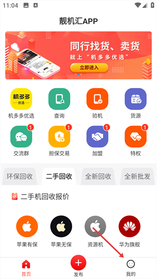 1、首先登录靓机汇App后,将进入主页面,在首页可以看到各类手机回收和批发相关服务入口,操作界面清晰直观。