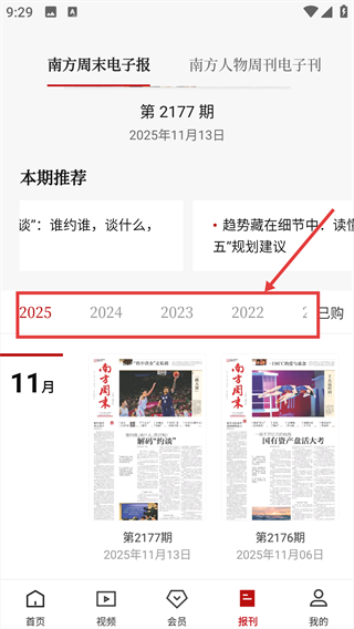 2、进入报刊页面后,可滑动【2025】【2024】等年份选择栏,选择想要查看的年份。