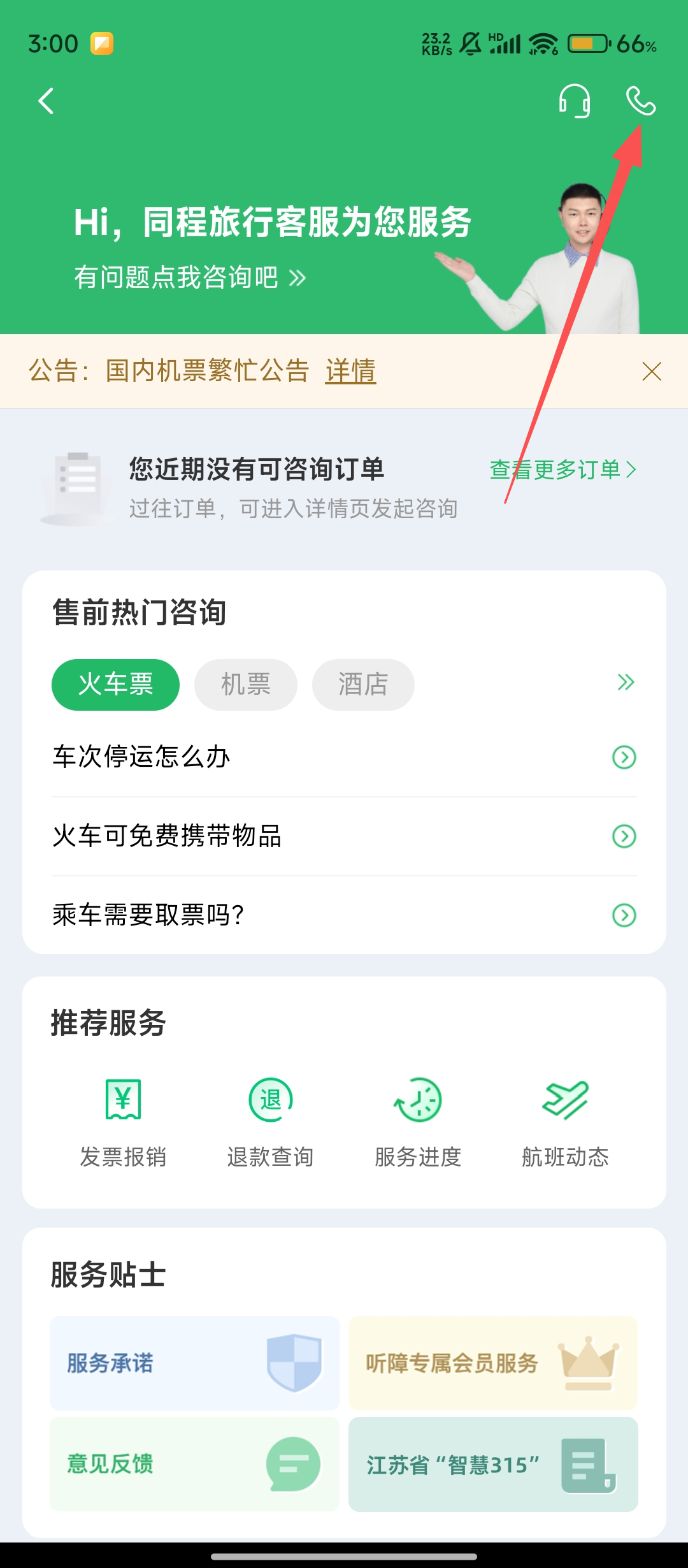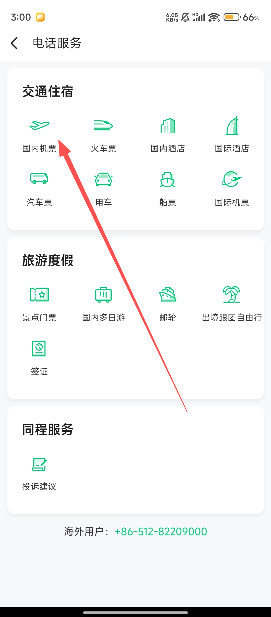 4、在电话服务页面,选择对应服务类别,如【国内机票】,即可找到人工客服的相关入口,轻松解决旅行疑问哦。