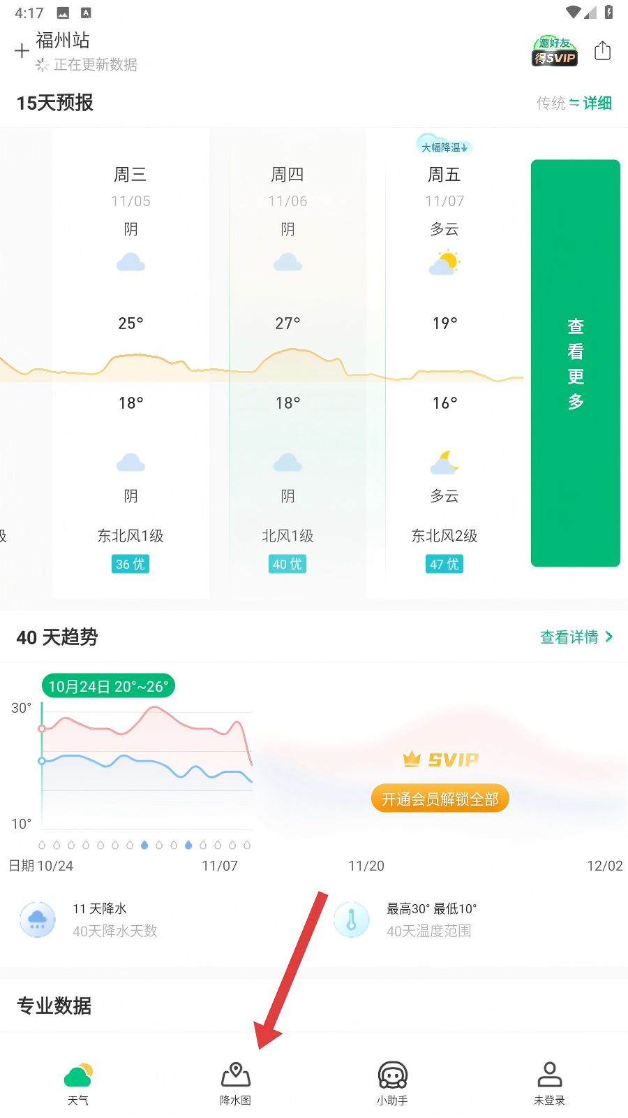 1、打开彩云天气,点击底部【降水图】,进入降水地图界面,开启查看云图的探索之旅啦。
