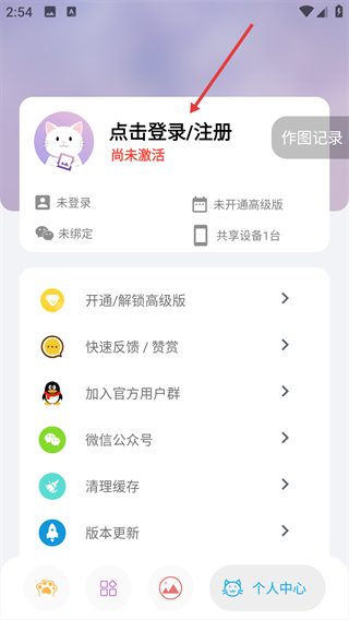 2、在个人中心页面,点击“点击登录/注册”区域。