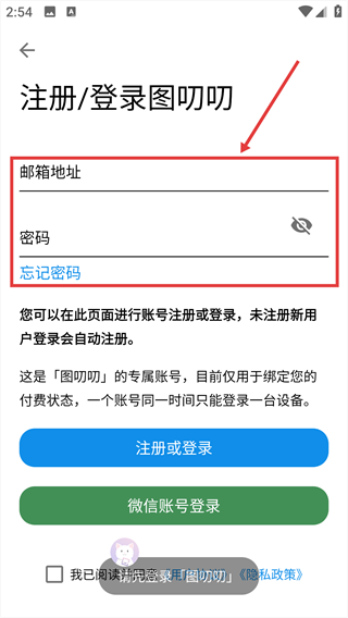 3、进入在注册/登录页面,填写邮箱地址与密码。