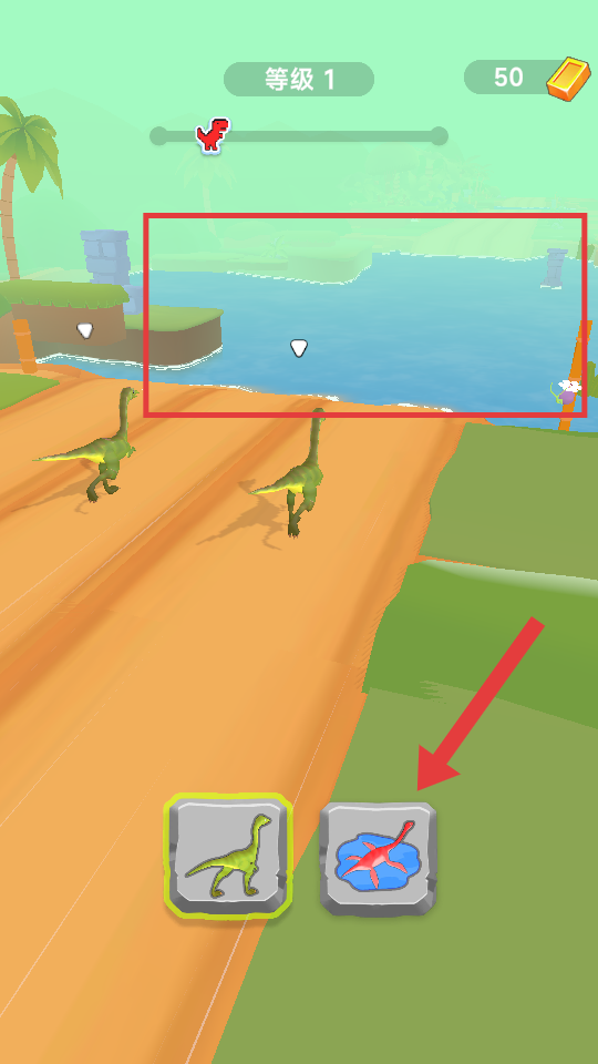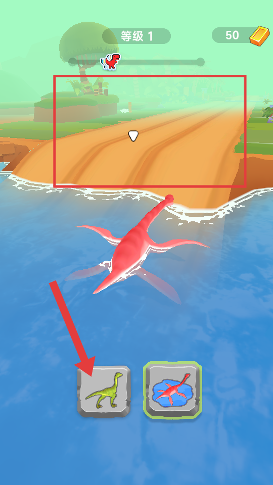 2、进入游戏后,当遇到红框标识的【水域】时,点击水域对应的【红色水生恐龙】图标,让恐龙切换为水中形态前进。