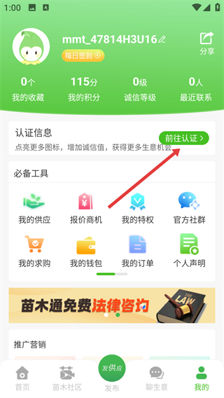 1、我们需要打开苗木通,进入首页后点击底部的【我的】选项,进入主页呢。