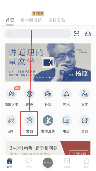 1、在首页,找到功能入口中的【文创】选项,点击它即可进入对应的板块。