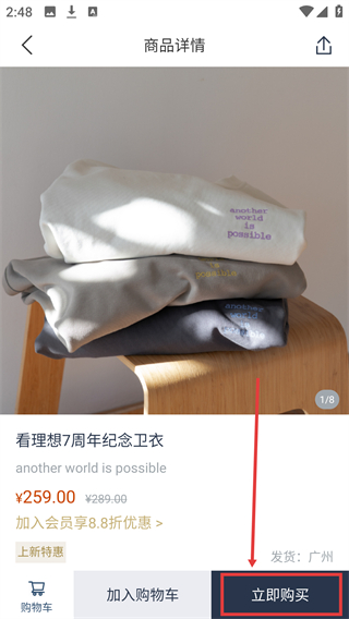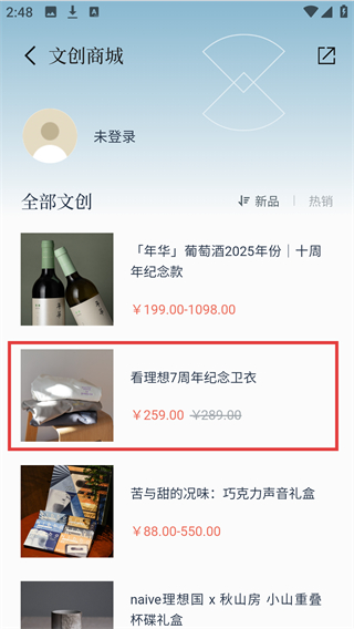 2、进入【文创商城】页面后,能看到各类文创商品,比如【看理想7周年纪念卫衣】,可查看其价格等信息。