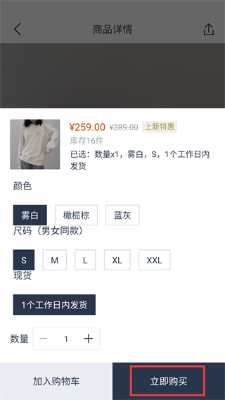 4、在商品选择页面,可挑选【雾白】等颜色、【S】等尺码,确认后再次点击【立即购买】即可完成下单流程。