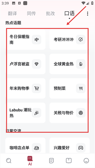 2、在界面中选择“口语”标签,进入口语练习板块,从热点话题列表里选中想要的话题。