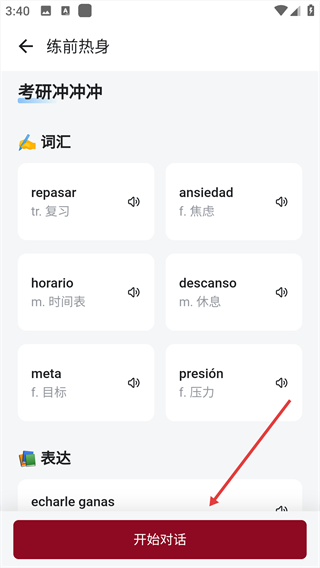 3、进入“练前热身”页面,查看配套的词汇、表达内容后,点击底部“开始对话”按钮。