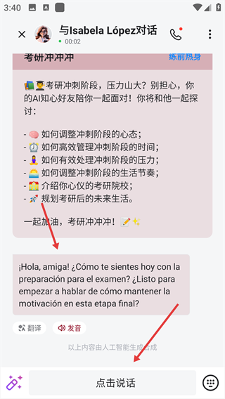 4、根据系统发起的口语提问,点击“点击说话”按钮,进行口语互动练习。