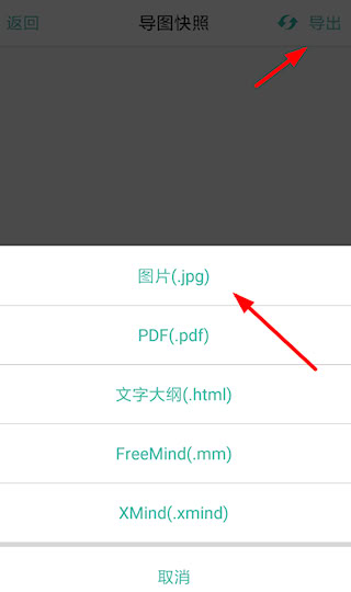 2、进入导图快照页面后,点击右上角“导出”功能,选择图片(.jpg)格式导出。
