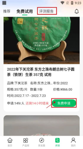 2、进入免费使用页面,滑动屏幕选择想要试用的茶品,右侧可查看测试报告;