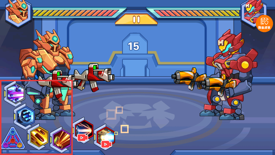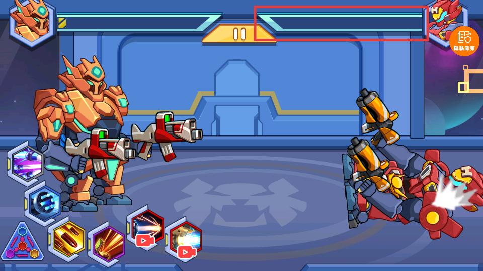 2、进入关卡战斗场景后,利用红框内的【技能图标】,点击释放技能来攻击敌方机器人。