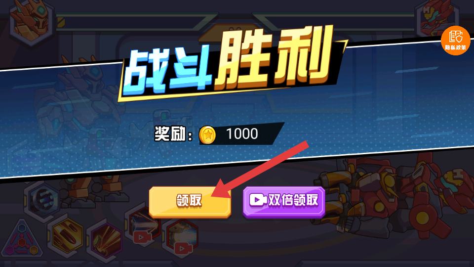 4、成功击败敌方机器人,出现【战斗胜利】提示后,点击【领取】按钮获取战斗奖励,准备挑战下一关。