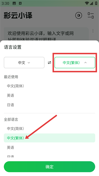 2、找到并选择【中文繁体】作为目标语言,设置好后点击确定,就能切换翻译语言啦。