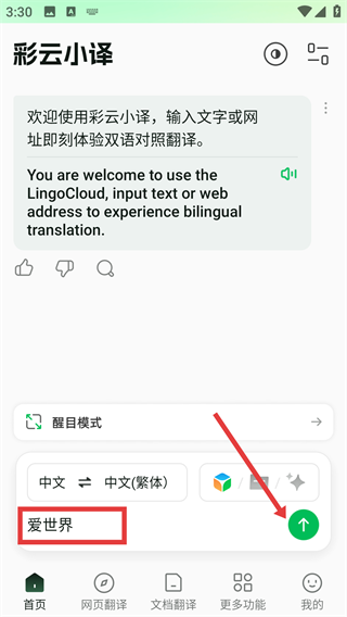 3、在输入框中输入需要翻译的内容,比如【爱世界】,然后点击绿色箭头,即可触发翻译功能哦。