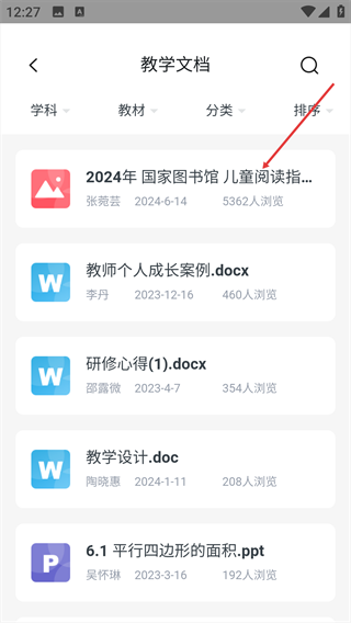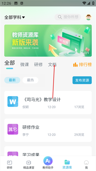 2、进入【资源库】页面后,点击【文档】分类标签。