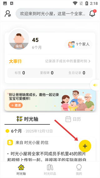 1、在【时光轴】页面,点击右下角黄色【+】按钮。