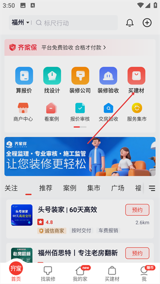1、打开齐家装修app,有首页、找装修、买建材、装新家和我的等版块,首页展示多种可选装修方案;