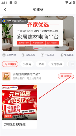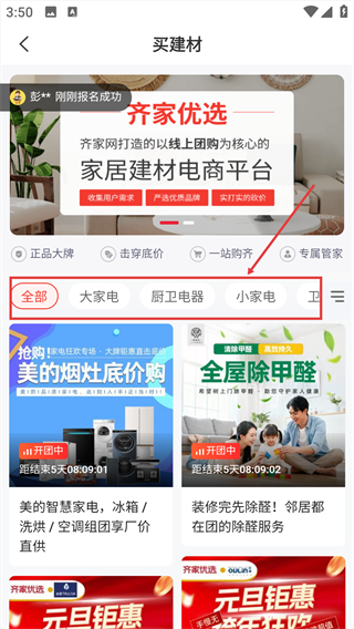 2、进入买建材页面,通过分类标签筛选目标品类,定位到对应类别的商品列表。