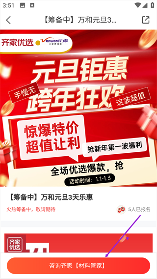 4、点击“咨询齐家【材料管家】”按钮,即可对接专属服务管家,获取该商品的相关咨询支持。