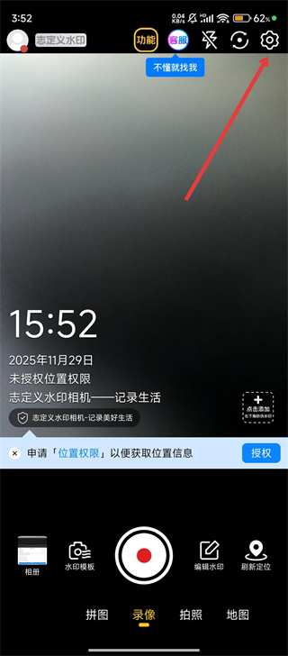 1、打开【自定义水印相机】软件,点击页面右上角的【设置】图标进入设置界面吧。