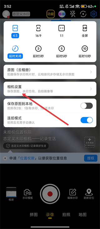 2、进入【自定义水印相机】设置页后,找到【相机设置】选项并点击它继续配置哦。