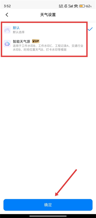 4、在天气设置页选定【默认】选项,再点底部的【确定】按钮就完成啦。