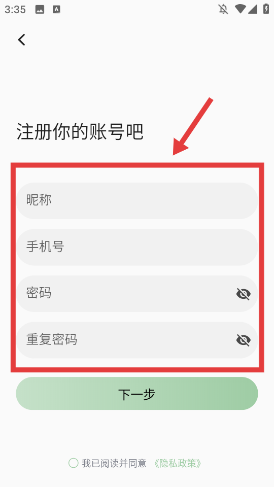 4、填写昵称、手机号、密码、重复密码后点击【下一步】,完成账号注册操作。