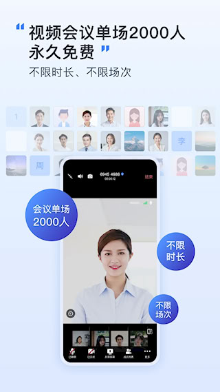 1、永久免费不限时功能:单场会议支持2000人规模,无时长、场次限制,降低企业协作成本。