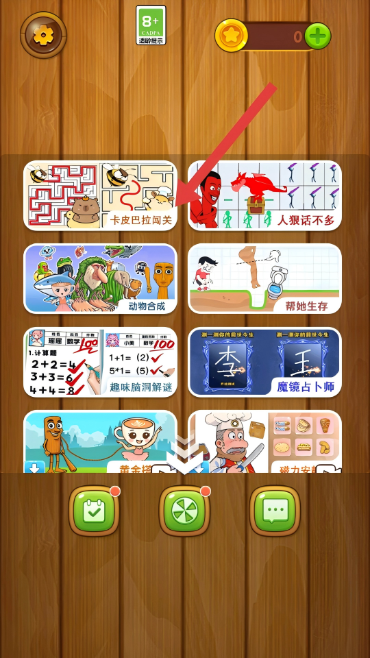 1、打开游戏,在主界面根据【红箭头】指引,点击【卡皮巴拉闯关】进入游戏关卡。