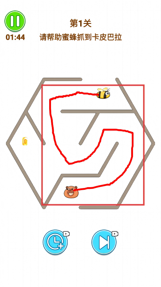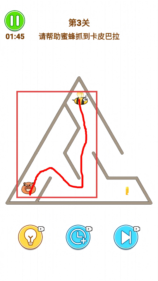 4、进入第3关,观察迷宫形状,在【红框】区域合理绘制路线,帮助蜜蜂在时间结束前抓到卡皮巴拉。