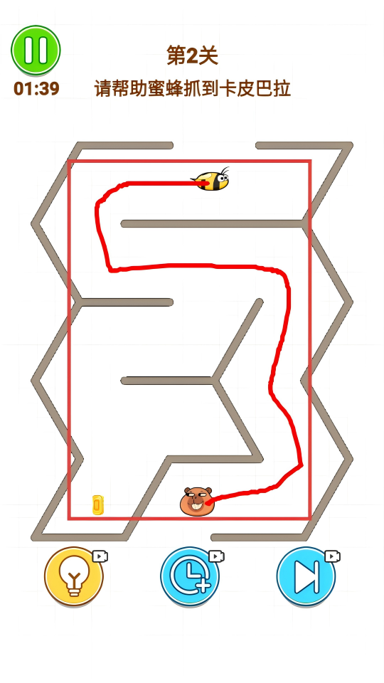 3、到第2关,注意【01:39】的时间限制,再次规划路线,让蜜蜂成功抓到卡皮巴拉,可借助下方功能按钮。