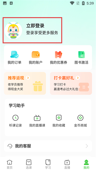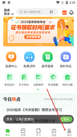 1、完成医学教育网app官方版下载安装后,进入应用,先完成注册登录,再点击底部“学习”入口。