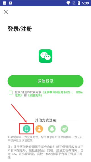 3、在登录/注册页,点击【手机图标】切换到手机号登录的操作界面。