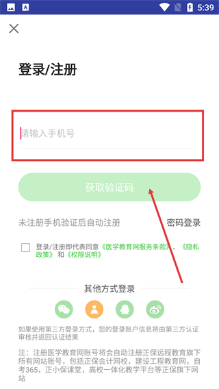 4、在手机号登录界面,先在【请输入手机号】框填写号码,勾选协议后点击【获取验证码】进行验证。